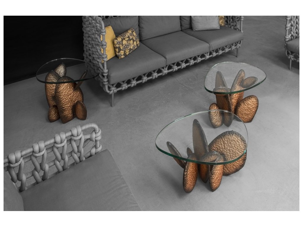 podnož stolku je kovová upravená měďováním, top stolu tvrzené číré sklo tloušťky 19 mm.