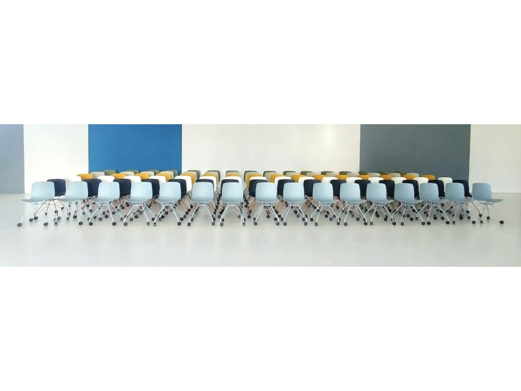 Židlička je otočná, na ocelové pavoučí podnoži, sedák z pevného polypropylénu z výběru barev.