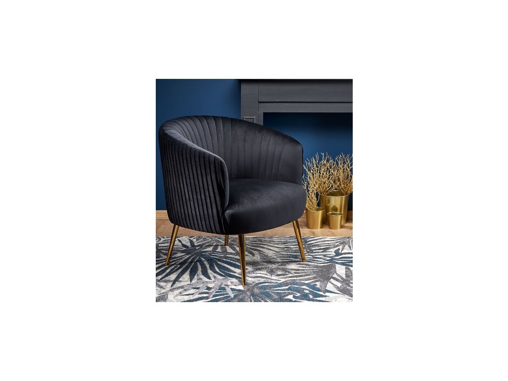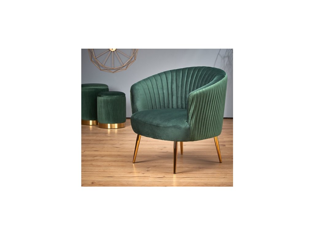 Křesílko Crown je čalouněné v látce velvet, provedení: tmavě zelená, černá , podnož kovová ve zlatém provedení